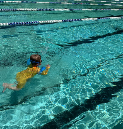 We're always working to make our suits as beach-proof as possible while keeping them fun & bright (because bright = safer visibility in water too!)
